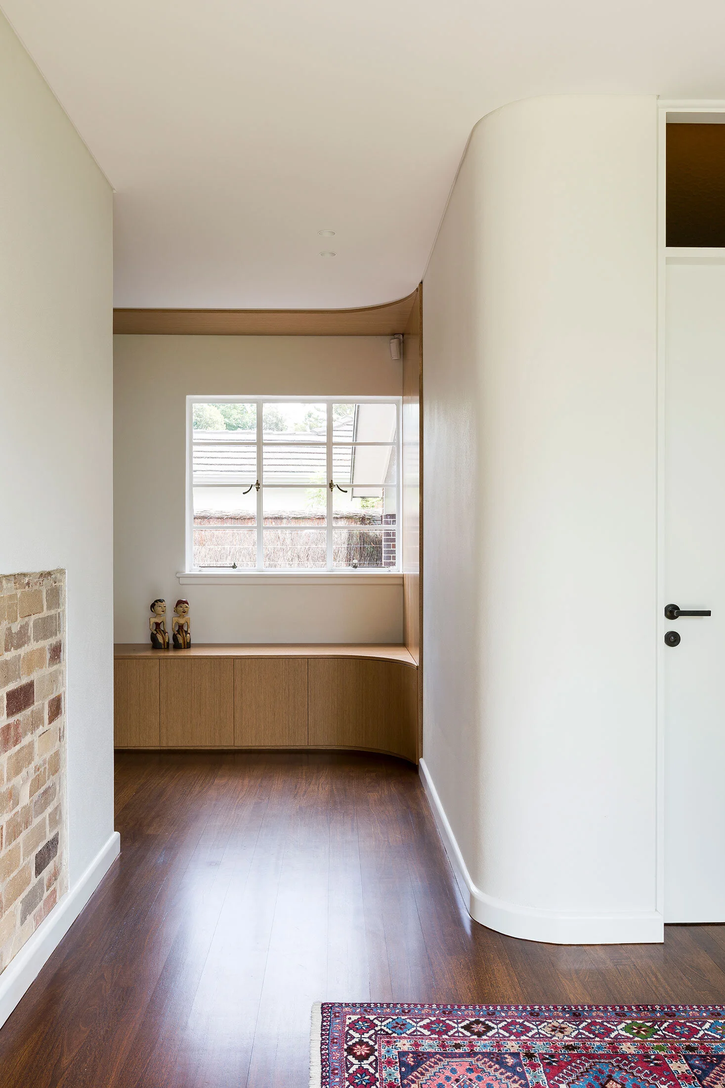 The open plan design of the addition dissolves the boundary between interior and exterior, strengthening the connection to the surrounding landscape & facilitating a variety of experiences defined by seasonal changes in the year. The side boundary sits to the north; thus, the challenge was to capture the sun while maintaining privacy in the key living areas. This was achieved through a high level of glazing on the exterior north-facing walls of the addition - the exception being one north-facing solid brick wall, carefully designed to obstruct the view from neighbouring houses. The house was instead opened to the park at the west, creating a visual transparency through the house in the east – west direction to experientially extend the site and further integrate the home with its natural surroundings.